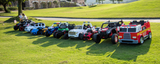 Safety features include seat belts, parental remote control, emergency stop, speed limiting functions, and sturdy construction. Detailed safety specs are listed on each product page.